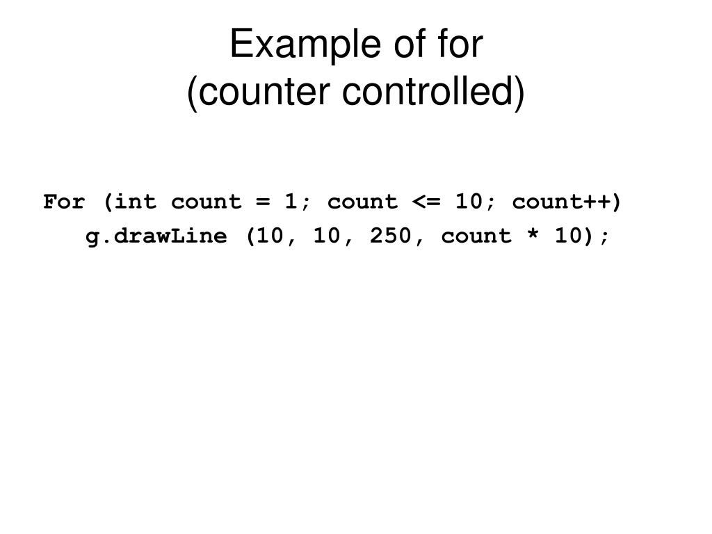 Example of for(counter controlled) For (int count = 1; count <= 10; count++) g.drawLine (10, 10, 250, count * 10);