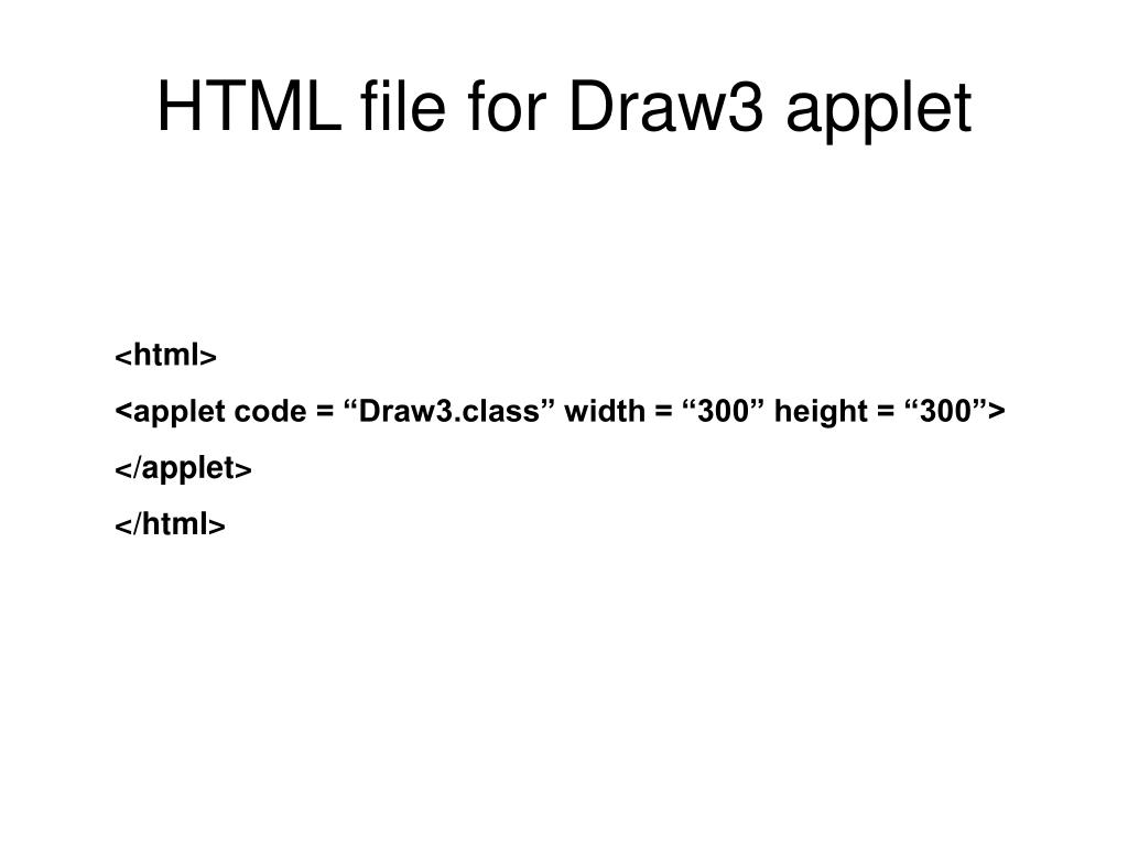 HTML file for Draw3 applet <html> <applet code = “Draw3.class” width = “300” height = “300”> </applet> </html>
