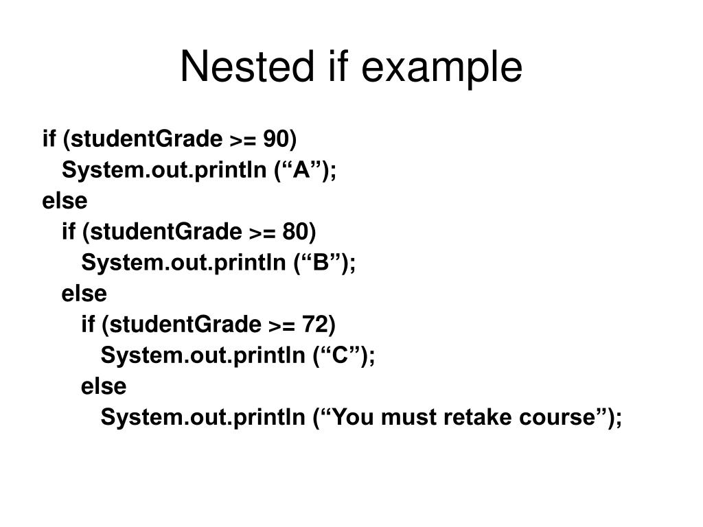 Nested if example if (studentGrade >= 90) System.out.println (“A”); else if (studentGrade >= 80) System.out.println (“B”); else if (studentGrade >= 72) System.out.println (“C”); else System.out.println (“You must retake course”);