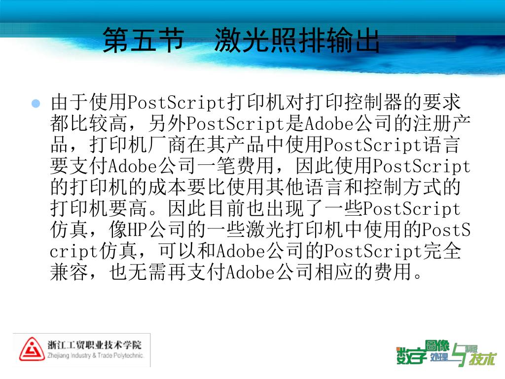 由于使用PostScript打印机对打印控制器的要求都比较高,另外PostScript是Adobe公司的注册产品,打印机厂商在其产品中使用PostScript语言要支付Adobe公司一笔费用,因此使用PostScript的打印机的成本要比使用其他语言和控制方式的打印机要高。因此目前也出现了一些PostScript仿真,像HP公司的一些激光打印机中使用的PostScript仿真,可以和Adobe公司的PostScript完全兼容,也无需再支付Adobe公司相应的费用。由于使用PostScript打印机对打印控制器的要求都比较高,另外PostScript是Adobe公司的注册产品,打印机厂商在其产品中使用PostScript语言要支付Adobe公司一笔费用,因此使用PostScript的打印机的成本要比使用其他语言和控制方式的打印机要高。因此目前也出现了一些PostScript仿真,像HP公司的一些激光打印机中使用的PostScript仿真,可以和Adobe公司的PostScript完全兼容,也无需再支付Adobe公司相应的费用。 第五节 激光照排输出