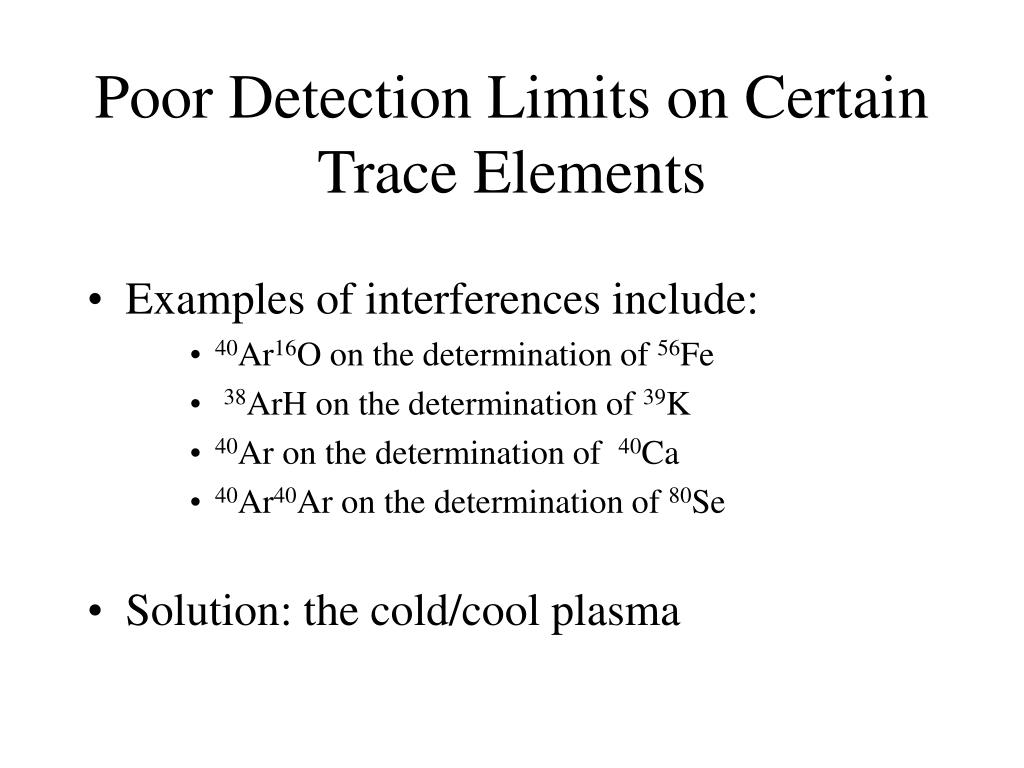 Poor Detection Limits on Certain Trace Elements • Examples of interferences include: • 40Ar16O on the determination of 56Fe • 38ArH on the determination of 39K • 40Ar on the determination of 40Ca • 40Ar40Ar on the determination of 80Se • Solution: the cold/cool plasma