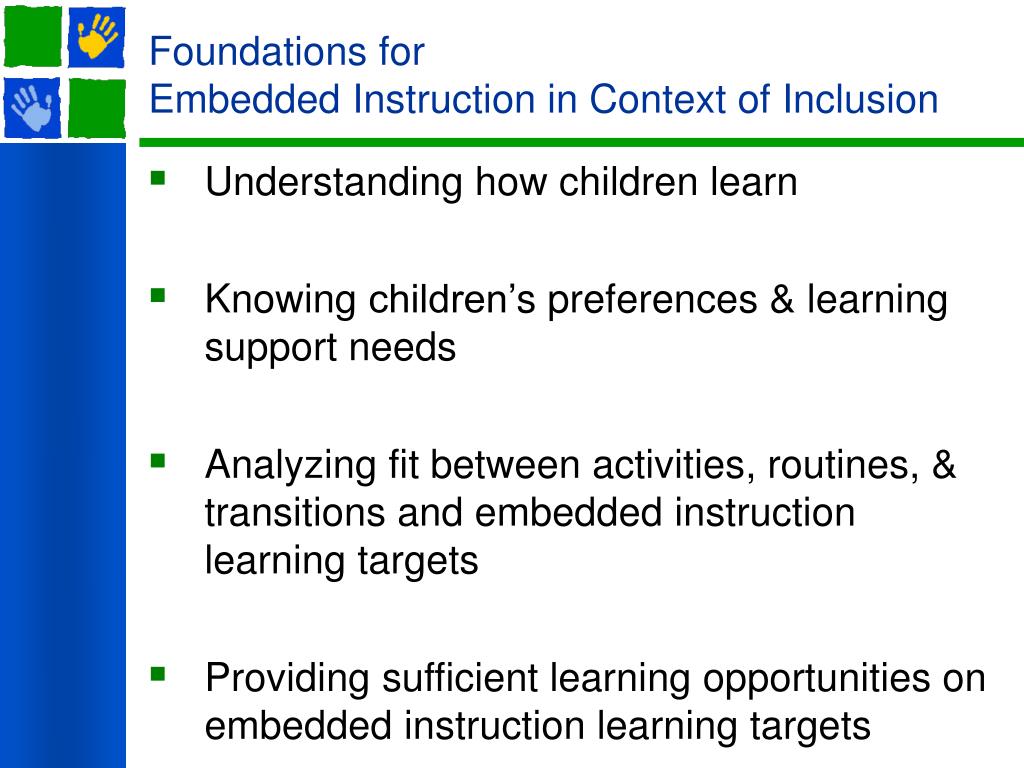 Foundations for Embedded Instruction in Context of Inclusion • Understanding how children learn • Knowing children’s preferences & learning support needs • Analyzing fit between activities, routines, & transitions and embedded instruction learning targets • Providing sufficient learning opportunities on embedded instruction learning targets