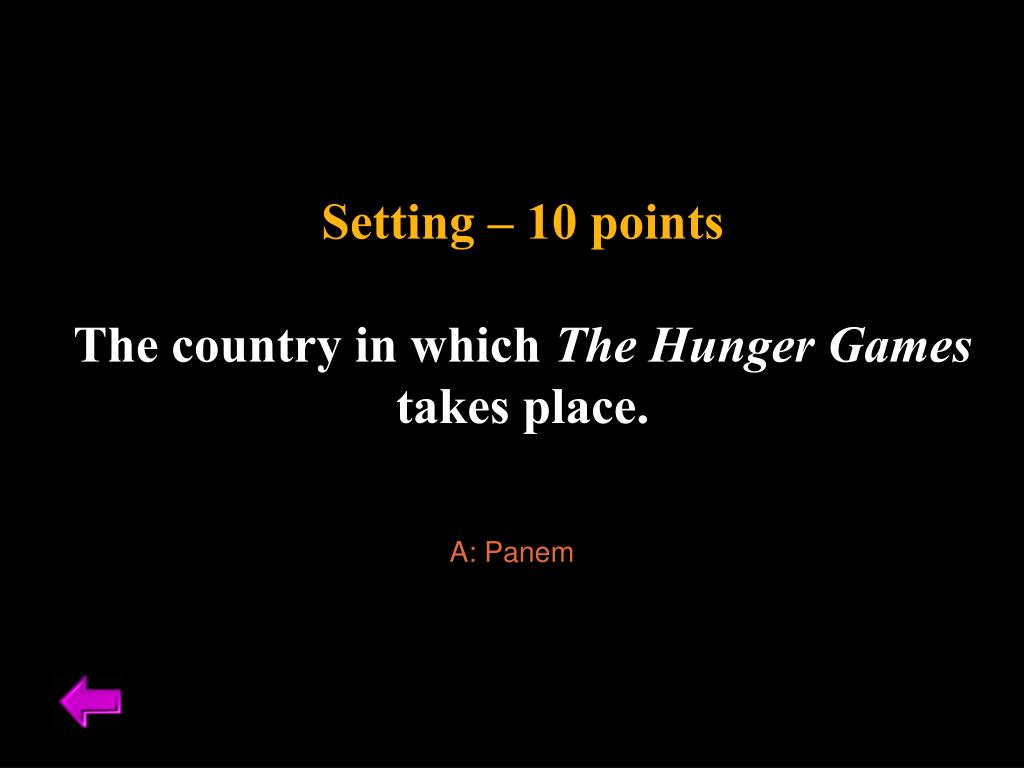 Setting – 10 points The country in which The Hunger Games takes place. A: Panem