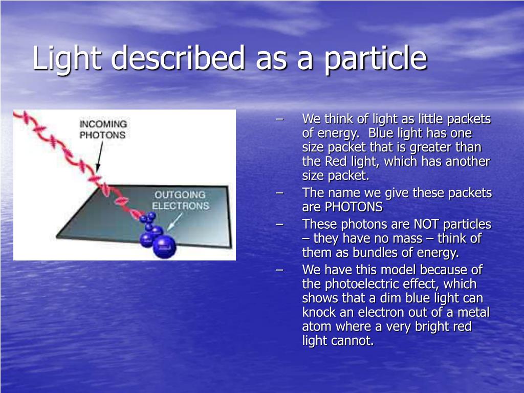 We think of light as little packets of energy. Blue light has one size packet that is greater than the Red light, which has another size packet. The name we give these packets are PHOTONS These photons are NOT particles – they have no mass – think of them as bundles of energy. We have this model because of the photoelectric effect, which shows that a dim blue light can knock an electron out of a metal atom where a very bright red light cannot. Light described as a particle