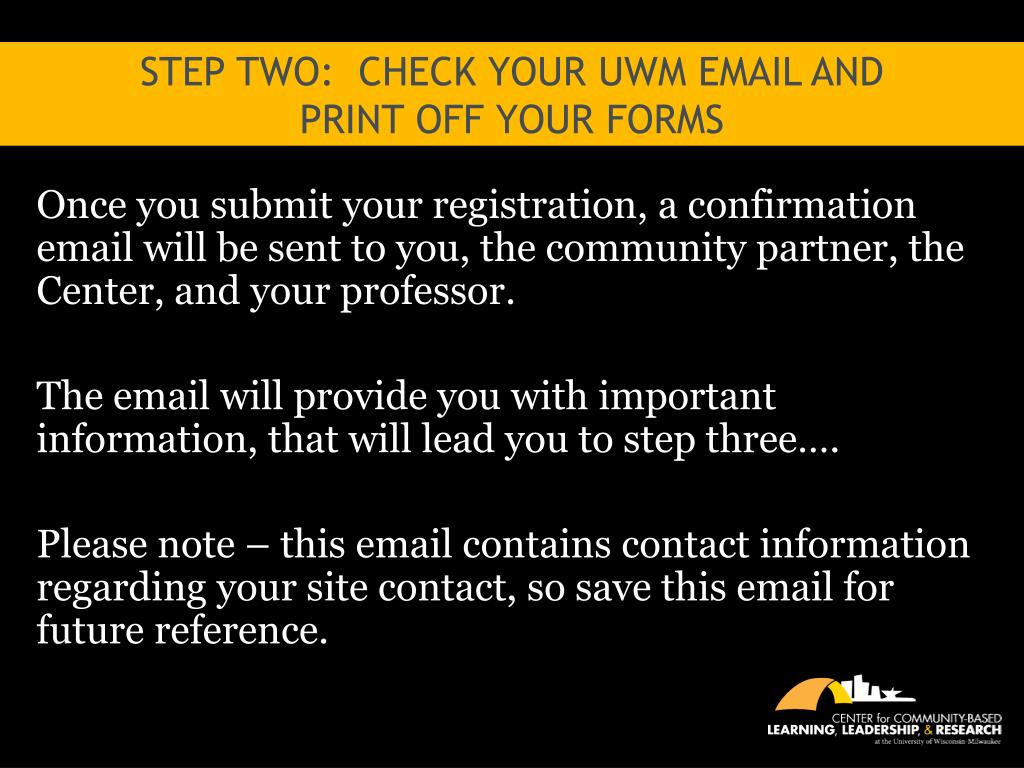 Step Two: check your uwm email and print off your forms Once you submit your registration, a confirmation email will be sent to you, the community partner, the Center, and your professor. The email will provide you with important information, that will lead you to step three…. Please note – this email contains contact information regarding your site contact, so save this email for future reference.