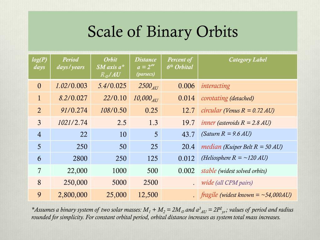 Scale of Binary Orbits *Assumes a binary system of two solar masses: M1 + M2 = 2M☉ and a3AU = 2P2yr ; values of period and radius rounded for simplicity. For constant orbital period, orbital distance increases as system total mass increases.