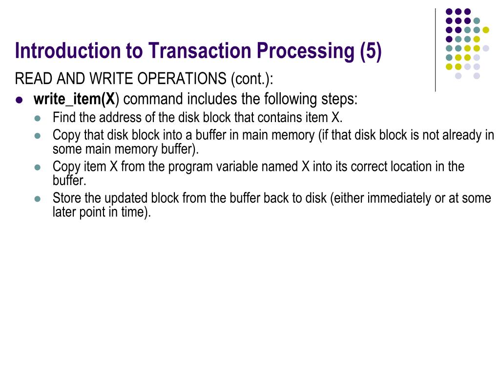 Introduction to Transaction Processing (4) READ AND WRITE OPERATIONS: • Basic unit of data transfer from the disk to the computer main memory is one block. In general, a data item (what is read or written) will be the field of some record in the database, although it may be a larger unit such as a record or even a whole block. • read_item(X) command includes the following steps: • Find the address of the disk block that contains item X. • Copy that disk block into a buffer in main memory (if that disk block is not already in some main memory buffer). • Copy item X from the buffer to the program variable named X.