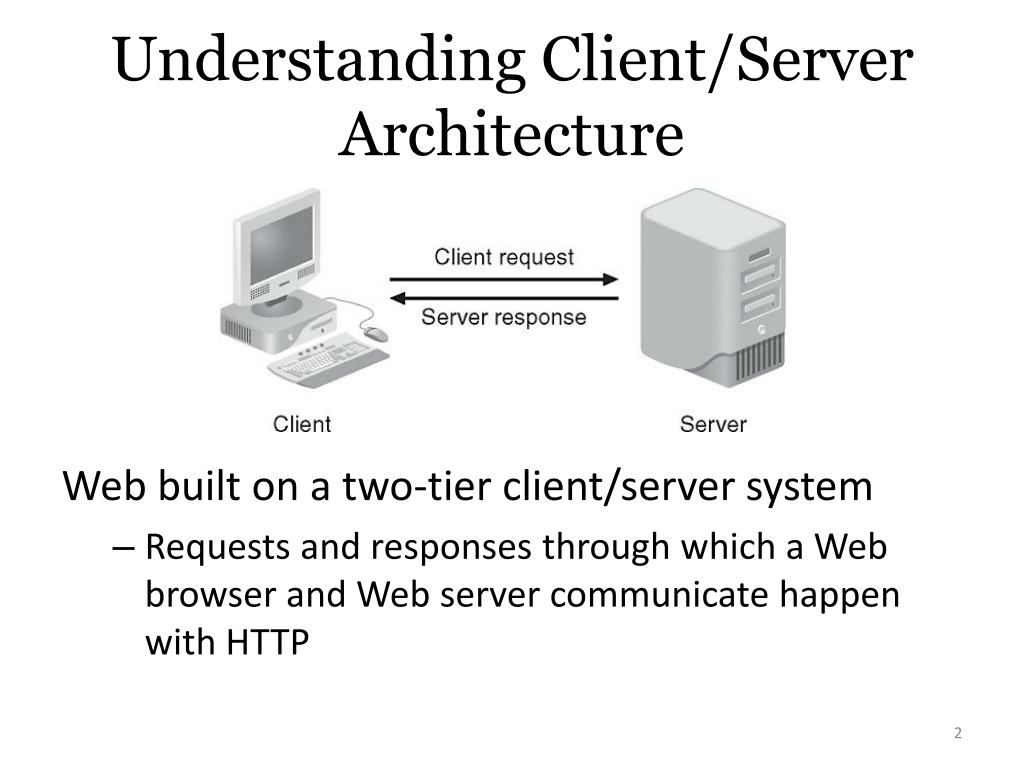 Understanding Client/Server Architecture Web built on a two-tier client/server system • Requests and responses through which a Web browser and Web server communicate happen with HTTP