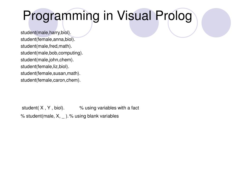 Programming in Visual Prolog student(male,harry,biol). student(female,anna,biol). student(male,fred,math). student(male,bob,computing). student(male,john,chem). student(female,liz,biol). student(female,susan,math). student(female,caron,chem). student( X , Y , biol).% using variables with a fact % student(male, X, _ ). % using blank variables