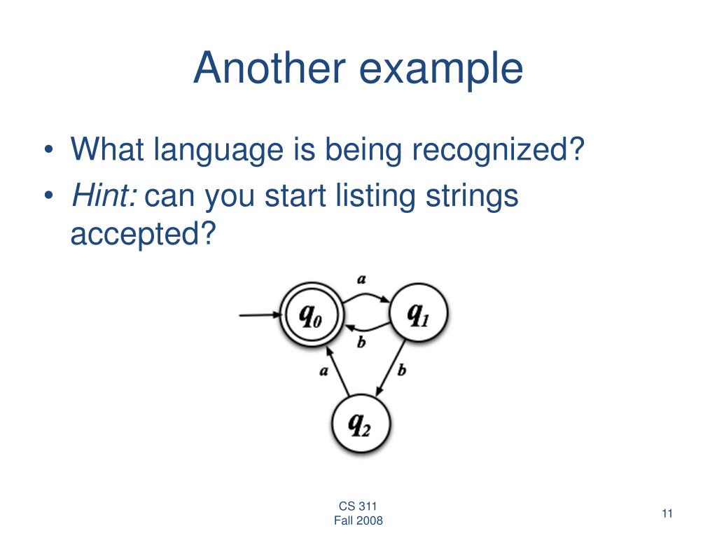 Another example • What language is being recognized? • Hint: can you start listing strings accepted?