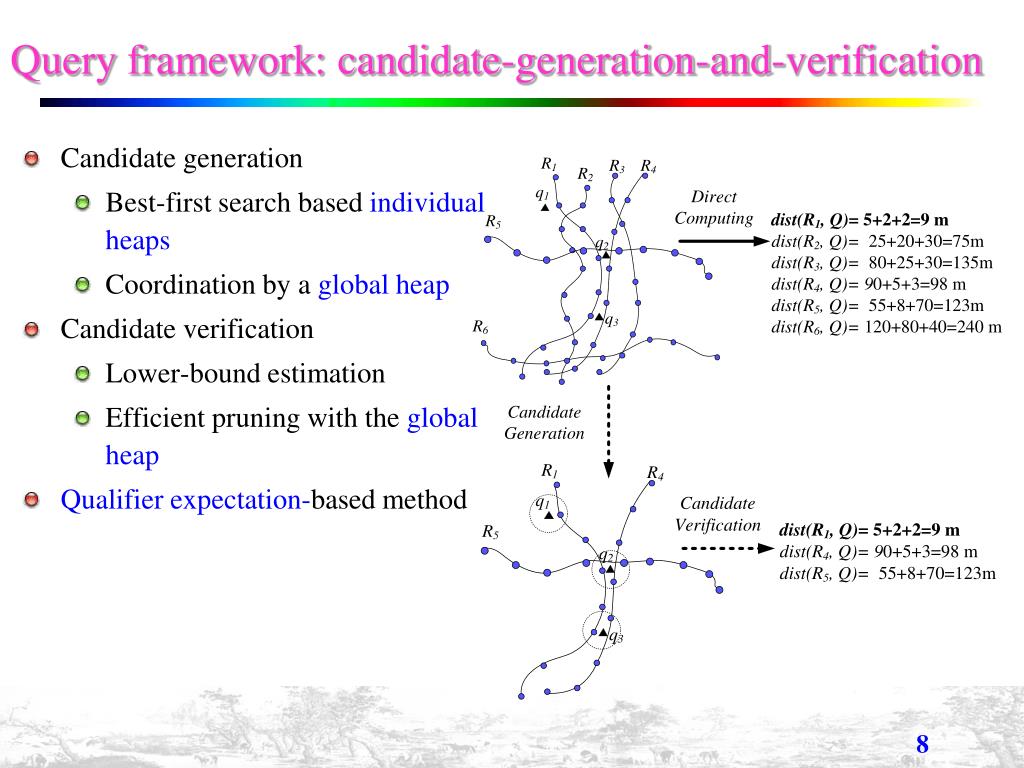 Query framework: candidate-generation-and-verification • Candidate generation • Best-first search based individual heaps • Coordination by a global heap • Candidate verification • Lower-bound estimation • Efficient pruning with the global heap • Qualifier expectation-based method