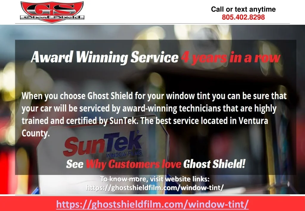Let’s Talk about your ride Ghost Shield Film 1168 Tourmaline Drive, Thousand Oaks, CA 91320 Telephone: 805.402.8298 Web: ghostshieldfilm.com To know more, visit website links: https://ghostshieldfilm.com/window-tint/