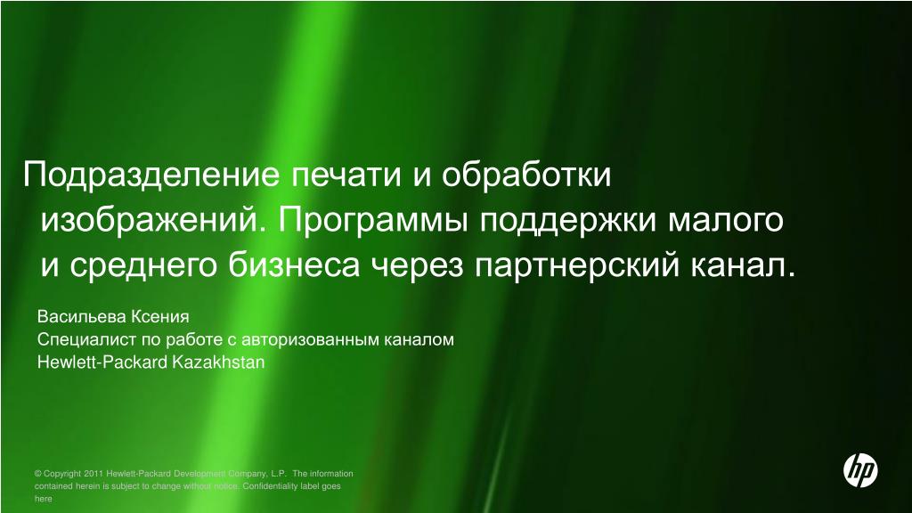 Подразделение печати и обработки изображени й . Программы поддержки малого и среднего бизнеса через партнерский канал. Васильева Ксения Специалист по работе с авторизованным каналом Hewlett-Packard Kazakhstan. Small and Medium Business. MAL Major Account List. SMB Small&Medium Business.