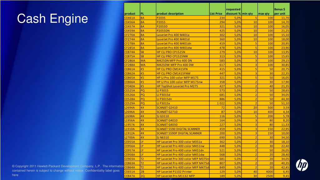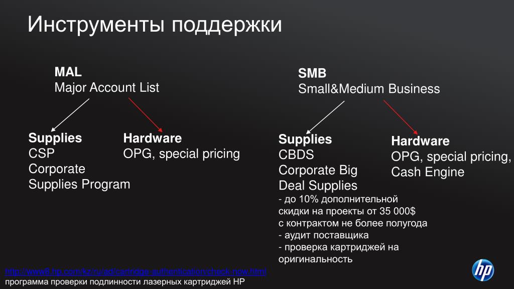 Инструменты поддержки MAL Major Account List SMB Small&Medium Business Supplies CSP Corporate Supplies Program Hardware OPG, special pricing • Supplies • CBDS • Corporate Big • Deal Supplies • до 10% дополнительной • скидки на проекты от 35000$ • с контрактом не более полугода • аудит поставщика • проверка картриджей на оригинальность Hardware OPG, special pricing, Cash Engine http://www8.hp.com/kz/ru/ad/cartridge-authentication/check-now.html программа проверки подлинности лазерных картриджей HP
