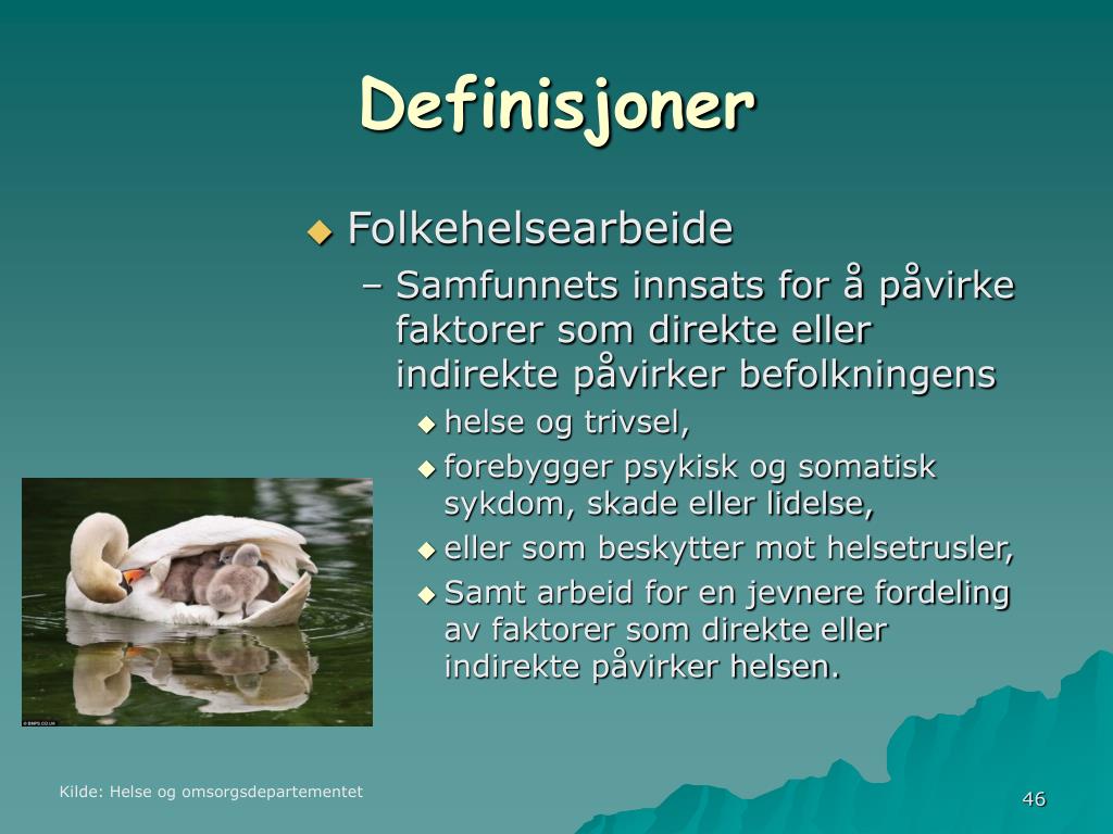 Definisjoner • Folkehelsearbeide • Samfunnets innsats for å påvirke faktorer som direkte eller indirekte påvirker befolkningens • helse og trivsel, • forebygger psykisk og somatisk sykdom, skade eller lidelse, • eller som beskytter mot helsetrusler, • Samt arbeid for en jevnere fordeling av faktorer som direkte eller indirekte påvirker helsen. Kilde: Helse og omsorgsdepartementet