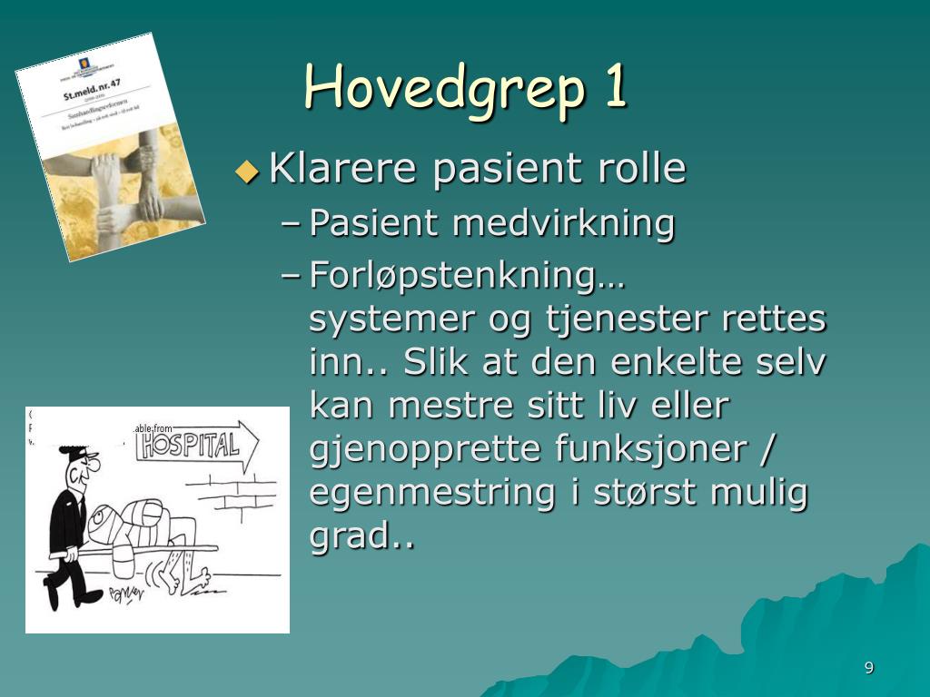 Hovedgrep 1 • Klarere pasient rolle • Pasient medvirkning • Forløpstenkning…systemer og tjenester rettes inn.. Slik at den enkelte selv kan mestre sitt liv eller gjenopprette funksjoner / egenmestring i størst mulig grad..