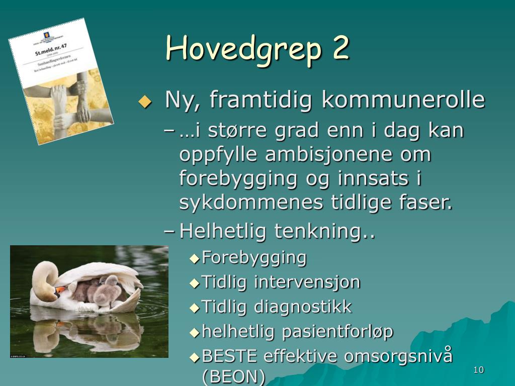 Hovedgrep 2 • Ny, framtidig kommunerolle • …i større grad enn i dag kan oppfylle ambisjonene om forebygging og innsats i sykdommenes tidlige faser. • Helhetlig tenkning.. • Forebygging • Tidlig intervensjon • Tidlig diagnostikk • helhetlig pasientforløp • BESTE effektive omsorgsnivå (BEON)