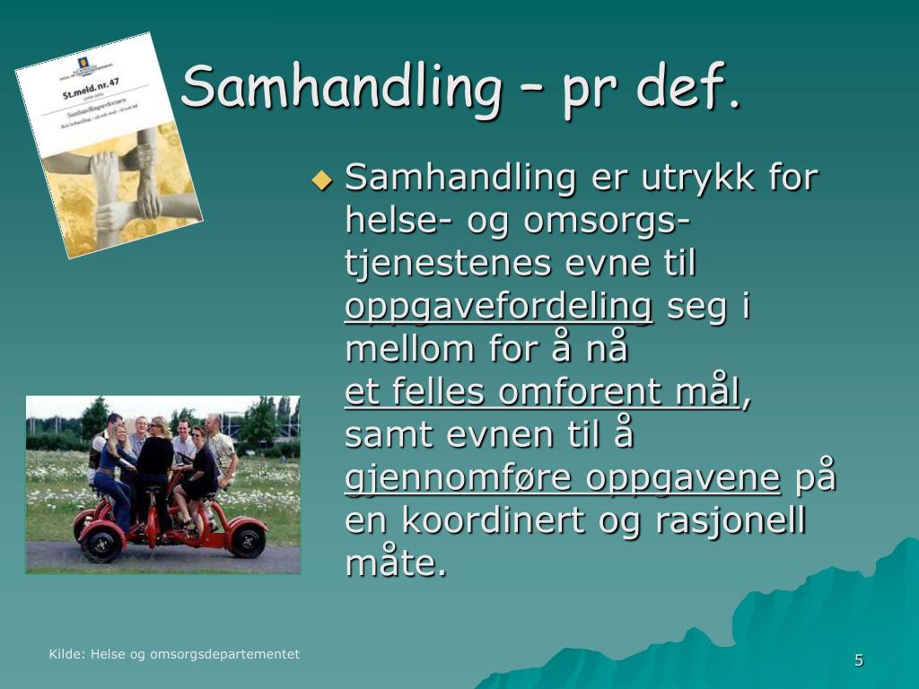 Samhandling – pr def. • Samhandling er utrykk for helse- og omsorgs-tjenestenes evne til oppgavefordeling seg i mellom for å nå et felles omforent mål, samt evnen til å gjennomføre oppgavene på en koordinert og rasjonell måte. Kilde: Helse og omsorgsdepartementet