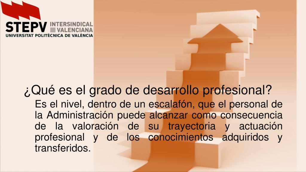 ¿Qué es el grado de desarrollo profesional? Es el nivel, dentro de un escalafón, que el personal de la Administración puede alcanzar como consecuencia de la valoración de su trayectoria y actuación profesional y de los conocimientos adquiridos y transferidos.