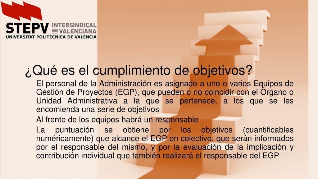 ¿Qué es el cumplimiento de objetivos? El personal de la Administración es asignado a uno o varios Equipos de Gestión de Proyectos (EGP), que pueden o no coincidir con el Órgano o Unidad Administrativa a la que se pertenece, a los que se les encomienda una serie de objetivos Al frente de los equipos habrá un responsable La puntuación se obtiene por los objetivos (cuantificables numéricamente) que alcance el EGP en colectivo, que serán informados por el responsable del mismo, y por la evaluación de la implicación y contribución individual que también realizará el responsable del EGP