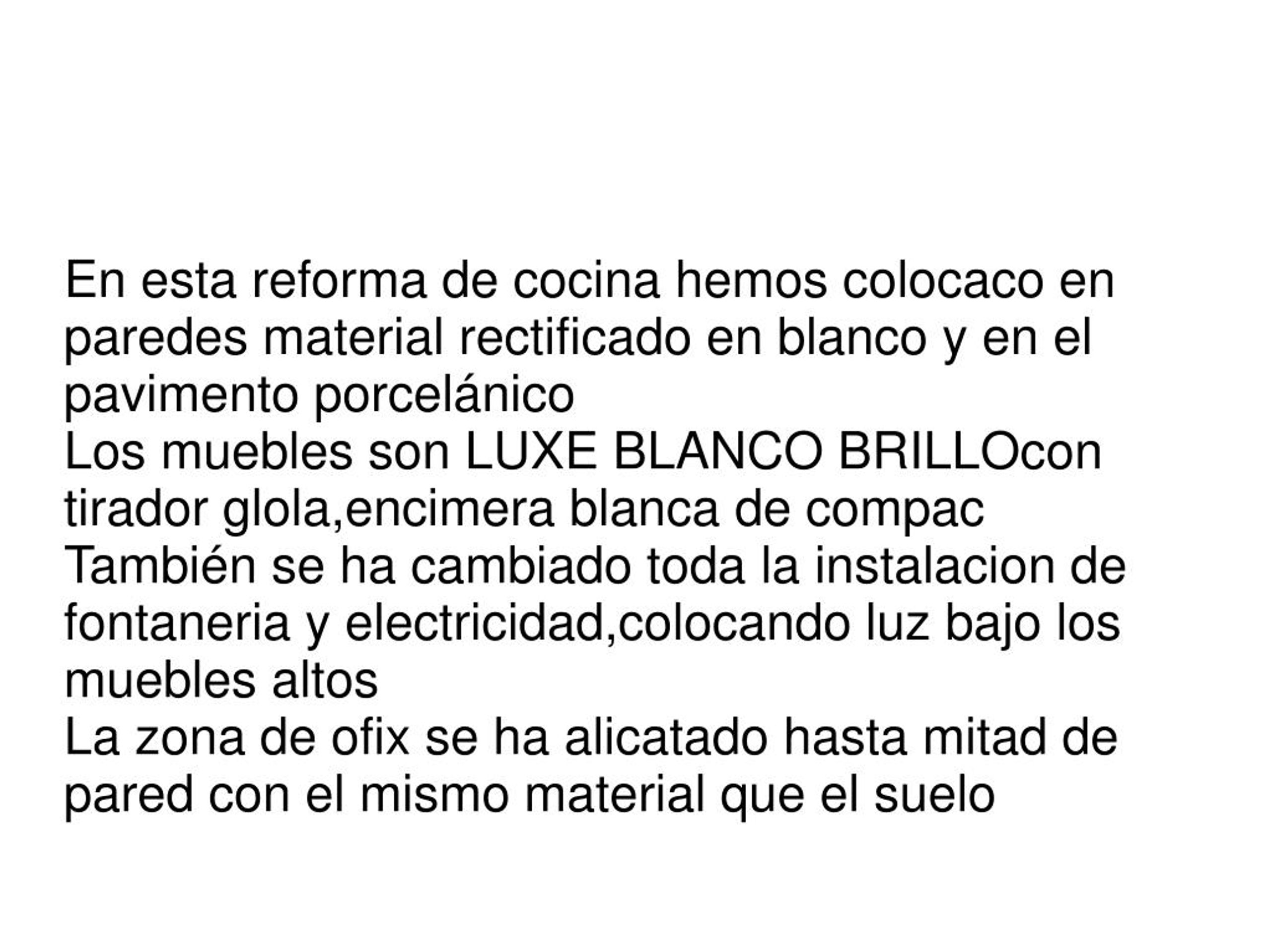 En esta reforma de cocina hemos colocaco en paredes material rectificado en blanco y en el pavimento porcelánico Los muebles son LUXE BLANCO BRILLOcon tirador glola,encimera blanca de compac También se ha cambiado toda la instalacion de fontaneria y electricidad,colocando luz bajo los muebles altos La zona de ofix se ha alicatado hasta mitad de pared con el mismo material que el suelo