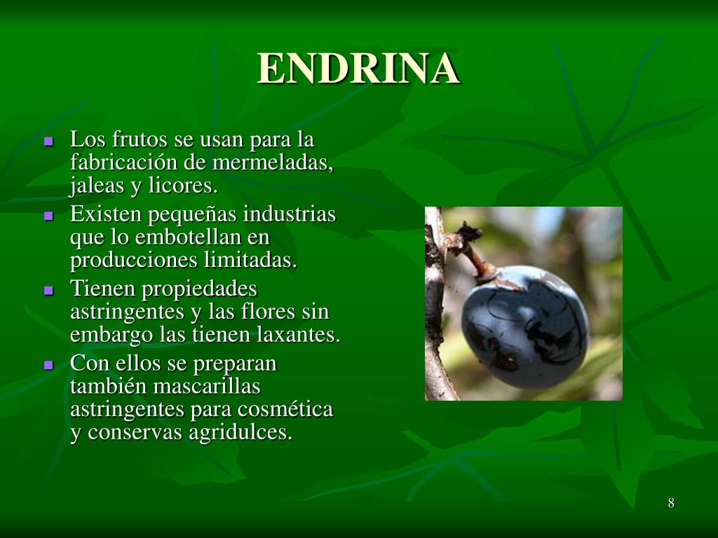ENDRINA • Los frutos se usan para la fabricación de mermeladas, jaleas y licores. • Existen pequeñas industrias que lo embotellan en producciones limitadas. • Tienen propiedades astringentes y las flores sin embargo las tienen laxantes. • Con ellos se preparan también mascarillas astringentes para cosmética y conservas agridulces.