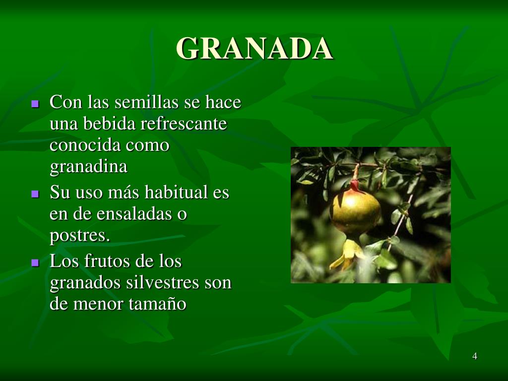 GRANADA • Con las semillas se hace una bebida refrescante conocida como granadina • Su uso más habitual es en de ensaladas o postres. • Los frutos de los granados silvestres son de menor tamaño