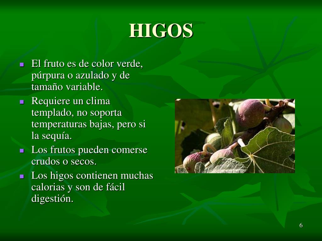 HIGOS • El fruto es de color verde, púrpura o azulado y de tamaño variable. • Requiere un clima templado, no soporta temperaturas bajas, pero si la sequía. • Los frutos pueden comerse crudos o secos. • Los higos contienen muchas calorias y son de fácil digestión.