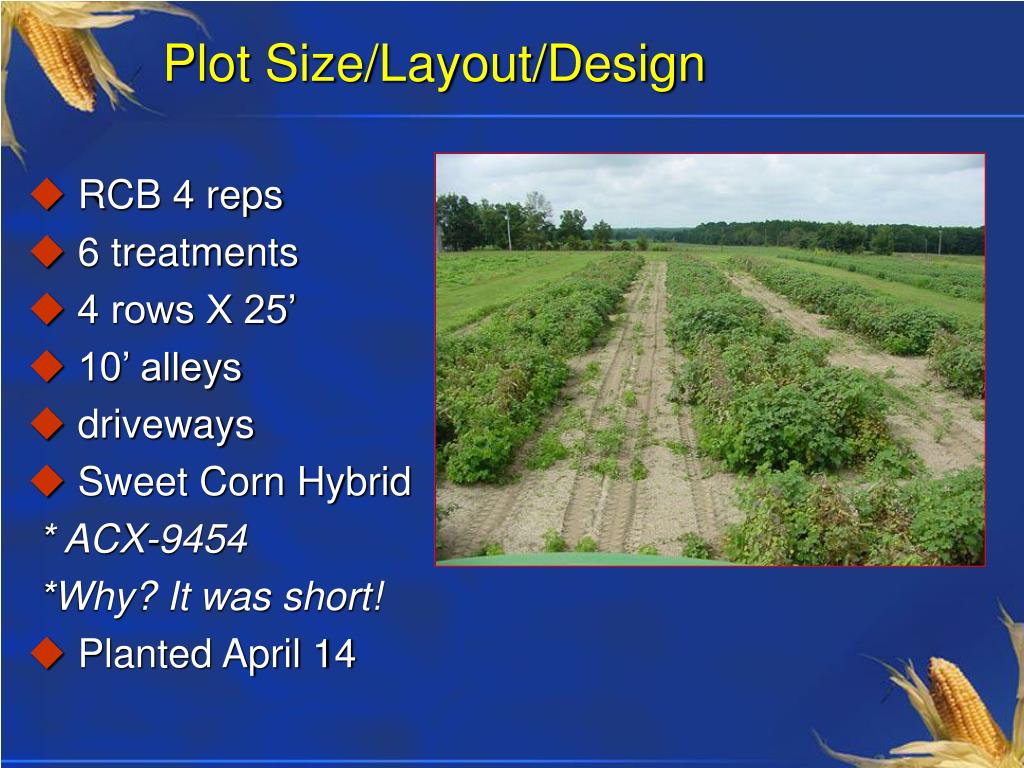 Plot Size/Layout/Design • RCB 4 reps • 6 treatments • 4 rows X 25’ • 10’ alleys • driveways • Sweet Corn Hybrid * ACX-9454 *Why? It was short! • Planted April 14