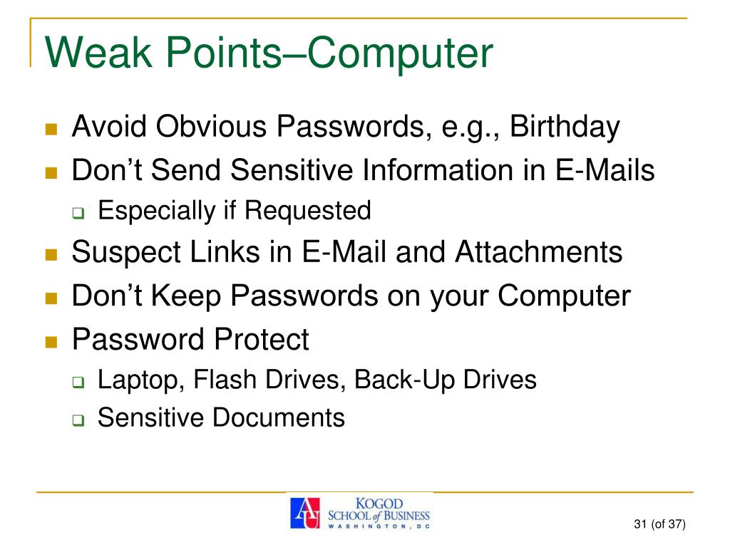 Weak Points–Computer • Avoid Obvious Passwords, e.g., Birthday • Don’t Send Sensitive Information in E-Mails • Especially if Requested • Suspect Links in E-Mail and Attachments • Don’t Keep Passwords on your Computer • Password Protect • Laptop, Flash Drives, Back-Up Drives • Sensitive Documents