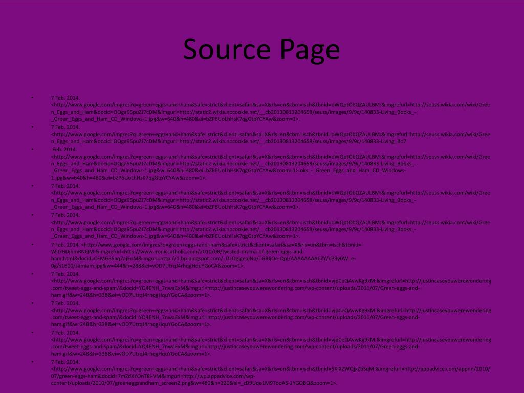 Source Page • 7 Feb. 2014. <http://www.google.com/imgres?q=green+eggs+and+ham&safe=strict&client=safari&sa=X&rls=en&tbm=isch&tbnid=oWQptObQZAULBM:&imgrefurl=http://seuss.wikia.com/wiki/Green_Eggs_and_Ham&docid=OQga95puZJ7cDM&imgurl=http://static2.wikia.nocookie.net/__cb20130813204658/seuss/images/9/9c/140833-Living_Books_-_Green_Eggs_and_Ham_CD_Windows-1.jpg&w=640&h=480&ei=bZP6UoLhHsK7qgGtpYCYAw&zoom=1>. • 7 Feb. 2014. <http://www.google.com/imgres?q=green+eggs+and+ham&safe=strict&client=safari&sa=X&rls=en&tbm=isch&tbnid=oWQptObQZAULBM:&imgrefurl=http://seuss.wikia.com/wiki/Green_Eggs_and_Ham&docid=OQga95puZJ7cDM&imgurl=http://static2.wikia.nocookie.net/__cb20130813204658/seuss/images/9/9c/140833-Living_Bo7 • Feb. 2014. <http://www.google.com/imgres?q=green+eggs+and+ham&safe=strict&client=safari&sa=X&rls=en&tbm=isch&tbnid=oWQptObQZAULBM:&imgrefurl=http://seuss.wikia.com/wiki/Green_Eggs_and_Ham&docid=OQga95puZJ7cDM&imgurl=http://static2.wikia.nocookie.net/__cb20130813204658/seuss/images/9/9c/140833-Living_Books_-_Green_Eggs_and_Ham_CD_Windows-1.jpg&w=640&h=480&ei=bZP6UoLhHsK7qgGtpYCYAw&zoom=1>.oks_-_Green_Eggs_and_Ham_CD_Windows-1.jpg&w=640&h=480&ei=bZP6UoLhHsK7qgGtpYCYAw&zoom=1>. • 7 Feb. 2014. <http://www.google.com/imgres?q=green+eggs+and+ham&safe=strict&client=safari&sa=X&rls=en&tbm=isch&tbnid=oWQptObQZAULBM:&imgrefurl=http://seuss.wikia.com/wiki/Green_Eggs_and_Ham&docid=OQga95puZJ7cDM&imgurl=http://static2.wikia.nocookie.net/__cb20130813204658/seuss/images/9/9c/140833-Living_Books_-_Green_Eggs_and_Ham_CD_Windows-1.jpg&w=640&h=480&ei=bZP6UoLhHsK7qgGtpYCYAw&zoom=1>. • 7 Feb. 2014. <http://www.google.com/imgres?q=green+eggs+and+ham&safe=strict&client=safari&sa=X&rls=en&tbm=isch&tbnid=oWQptObQZAULBM:&imgrefurl=http://seuss.wikia.com/wiki/Green_Eggs_and_Ham&docid=OQga95puZJ7cDM&imgurl=http://static2.wikia.nocookie.net/__cb20130813204658/seuss/images/9/9c/140833-Living_Books_-_Green_Eggs_and_Ham_CD_Windows-1.jpg&w=640&h=480&ei=bZP6UoLhHsK7qgGtpYCYAw&zoom=1>. • 7 Feb. 2014. <http://www.google.com/imgres?q=green+eggs+and+ham&safe=strict&client=safari&sa=X&rls=en&tbm=isch&tbnid=-WjLrBDjbmRNQM:&imgrefurl=http://www.ironiccatholic.com/2010/08/twisted-drama-of-green-eggs-and-ham.html&docid=CEMG3Saq7ajEnM&imgurl=http://1.bp.blogspot.com/_DLOgigeajNo/TGRIjOe-QpI/AAAAAAAACZY/d33y0W_e-0g/s1600/samiam.jpg&w=444&h=288&ei=vOD7UtrqJ4rhqgHquYGoCA&zoom=1>. • 7 Feb. 2014. <http://www.google.com/imgres?q=green+eggs+and+ham&safe=strict&client=safari&sa=X&rls=en&tbm=isch&tbnid=vjpCeQAvwKg9xM:&imgrefurl=http://justincaseyouwerewondering.com/tweet-eggs-and-spam/&docid=YQ4ENH_7nwaExM&imgurl=http://justincaseyouwerewondering.com/wp-content/uploads/2011/07/Green-eggs-and-ham.gif&w=248&h=338&ei=vOD7UtrqJ4rhqgHquYGoCA&zoom=1>. • 7 Feb. 2014. <http://www.google.com/imgres?q=green+eggs+and+ham&safe=strict&client=safari&sa=X&rls=en&tbm=isch&tbnid=vjpCeQAvwKg9xM:&imgrefurl=http://justincaseyouwerewondering.com/tweet-eggs-and-spam/&docid=YQ4ENH_7nwaExM&imgurl=http://justincaseyouwerewondering.com/wp-content/uploads/2011/07/Green-eggs-and-ham.gif&w=248&h=338&ei=vOD7UtrqJ4rhqgHquYGoCA&zoom=1>. • 7 Feb. 2014. <http://www.google.com/imgres?q=green+eggs+and+ham&safe=strict&client=safari&sa=X&rls=en&tbm=isch&tbnid=vjpCeQAvwKg9xM:&imgrefurl=http://justincaseyouwerewondering.com/tweet-eggs-and-spam/&docid=YQ4ENH_7nwaExM&imgurl=http://justincaseyouwerewondering.com/wp-content/uploads/2011/07/Green-eggs-and-ham.gif&w=248&h=338&ei=vOD7UtrqJ4rhqgHquYGoCA&zoom=1>. • 7 Feb. 2014. <http://www.google.com/imgres?q=green+eggs+and+ham&safe=strict&client=safari&sa=X&rls=en&tbm=isch&tbnid=5XiXZWQjxZbSqM:&imgrefurl=http://appadvice.com/appnn/2010/07/green-eggs-ham&docid=7mZdXYOnT8l-VM&imgurl=http://wp.appadvice.com/wp-content/uploads/2010/07/greeneggsandham_screen2.png&w=480&h=320&ei=_zD9Uqe1M9TooAS-1YGQBQ&zoom=1>.