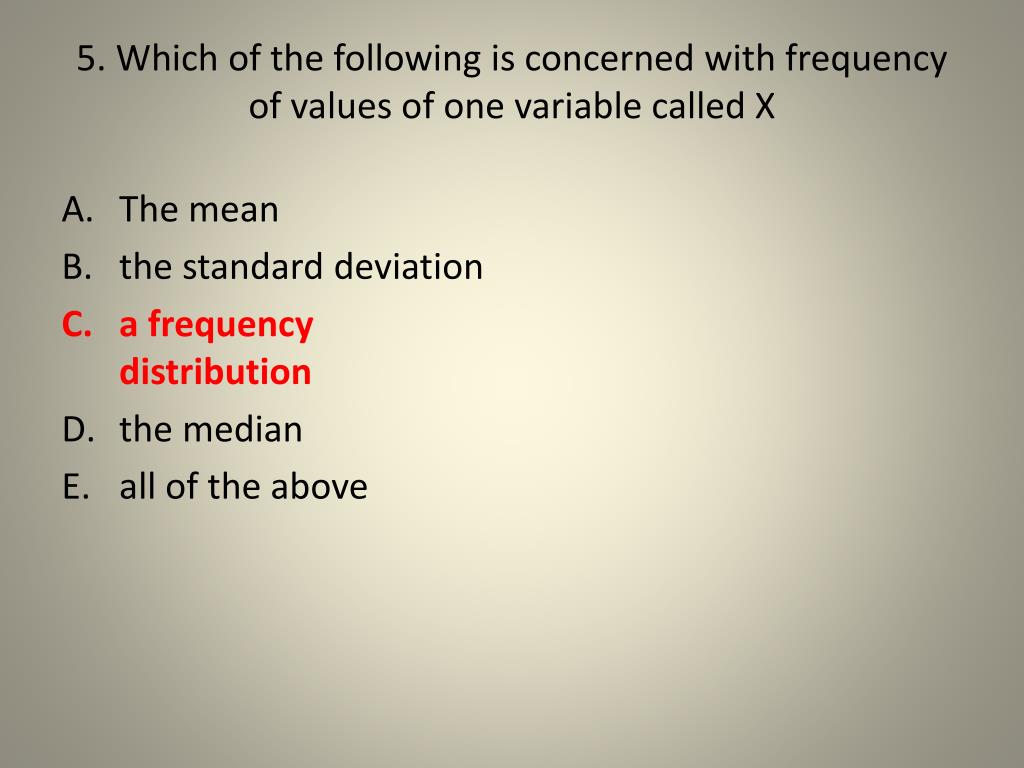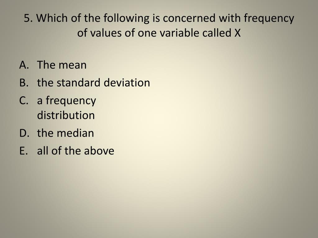 5. Which of the following is concerned with frequency of values of one variable called X • The mean • the standard deviation • a frequency distribution • the median • all of the above