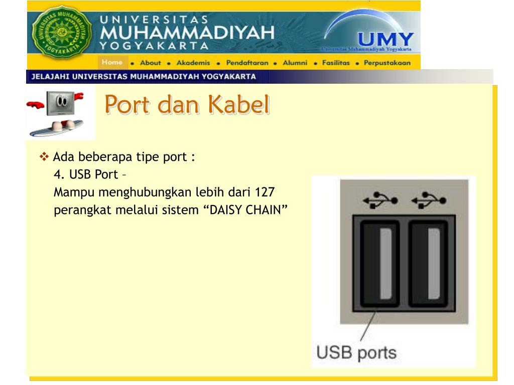 Port dan Kabel • Ada beberapa tipe port : 4. USB Port – Mampu menghubungkan lebih dari 127 perangkat melalui sistem “DAISY CHAIN”