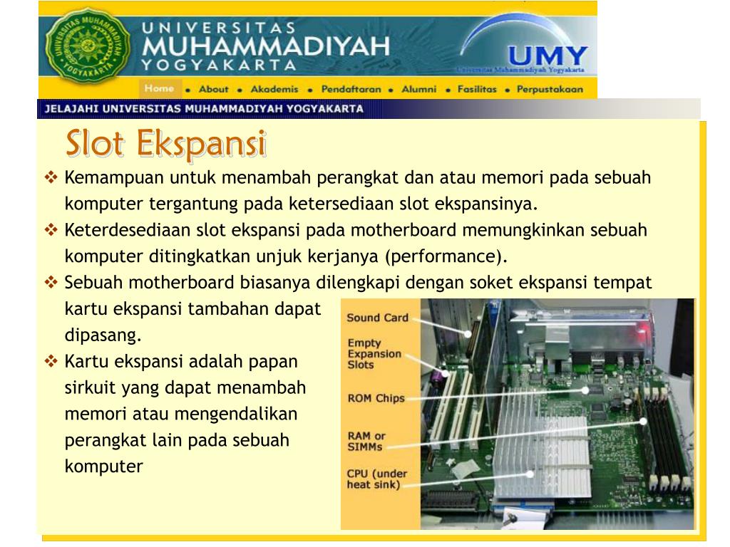 Slot Ekspansi. Slot Ekspansi. Kemampuan untuk menambah perangkat dan atau memori pada sebuah komputer tergantung pada ketersediaan slot ekspansinya. Keterdesediaan slot ekspansi pada motherboard memungkinkan sebuah komputer ditingkatkan unjuk kerjanya (performance).