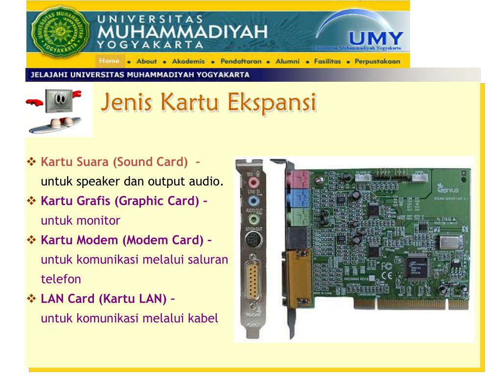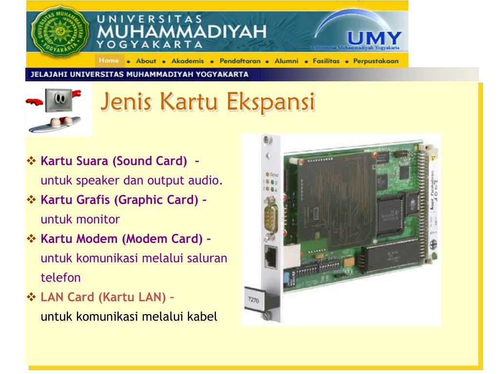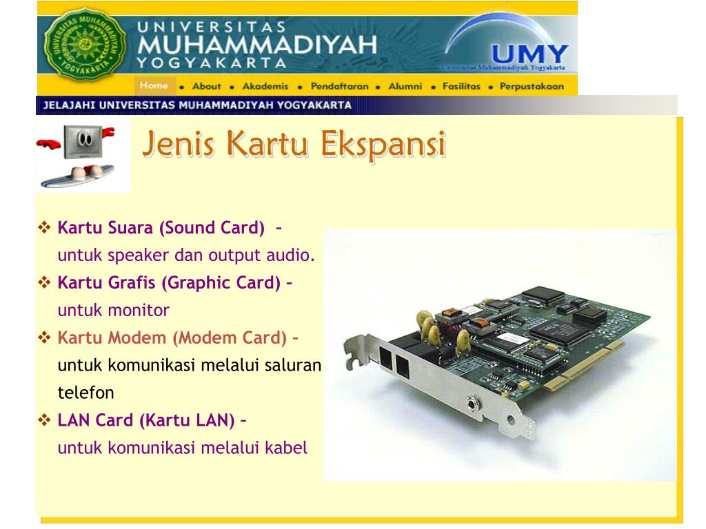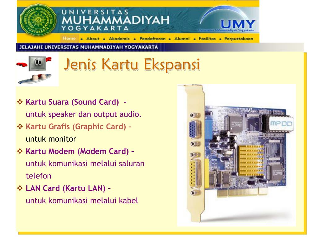 Jenis Kartu Ekspansi • Kartu Suara (Sound Card) – untuk speaker dan output audio. • Kartu Grafis (Graphic Card) – untuk monitor • Kartu Modem (Modem Card) – untuk komunikasi melalui saluran telefon • LAN Card (Kartu LAN) – untuk komunikasi melalui kabel