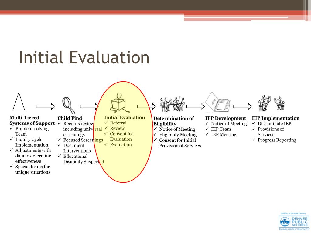 Initial Evaluation • Initial Evaluation • Referral • Review • Consent for Evaluation • Evaluation • Multi-Tiered • Systems of Support • Problem-solving Team • Inquiry Cycle Implementation • Adjustments with data to determine effectiveness • Special teams for unique situations • Child Find • Records review including universal screenings • Focused Screenings • Document Interventions • Educational Disability Suspected • IEP Development • Notice of Meeting • IEP Team • IEP Meeting • IEP Implementation • Disseminate IEP • Provisions of Services • Progress Reporting • Determination of Eligibility • Notice of Meeting • Eligibility Meeting • Consent for Initial Provision of Services