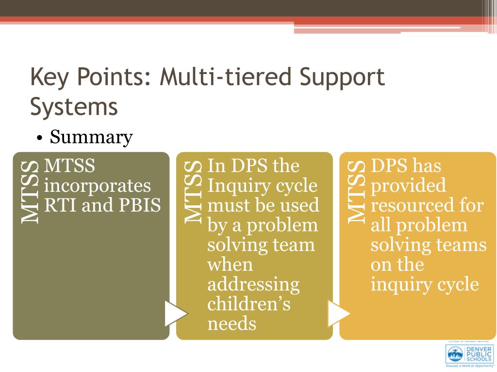 Multi-tiered Support Systems Participants will understand that Multi-tiered systems of support is an umbrella term for the Response to Intervention and Positive Behavior Intervention Supports. Participants will understand that MTSS is a problem solving process and that DPS has adopted a problem solving process called the DPS Inquiry Cycle. Participants will understand that ALL students who have a need should complete the problem solving process. • Objectives
