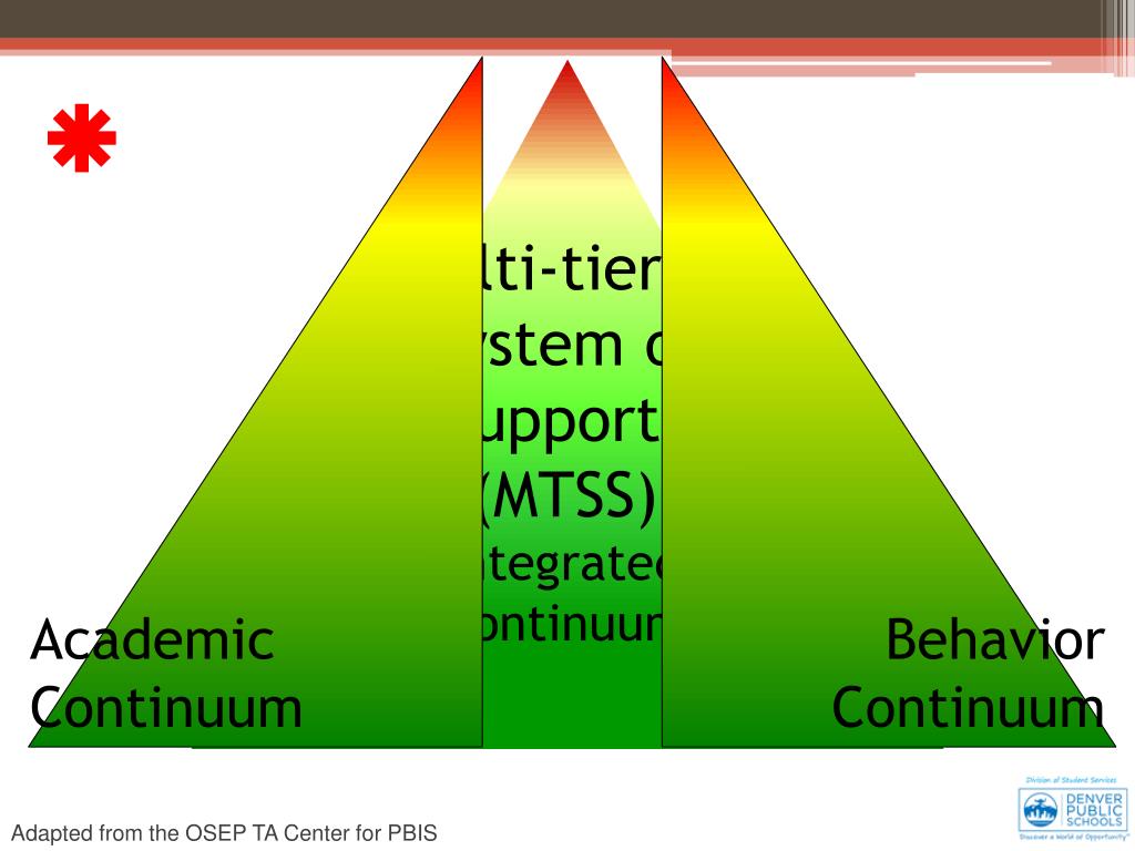 Multi-tiered System of Supports (MTSS) Integrated Continuum Academic Continuum Behavior Continuum Adapted from the OSEP TA Center for PBIS Adapted from the OSEP TA Center for PBIS