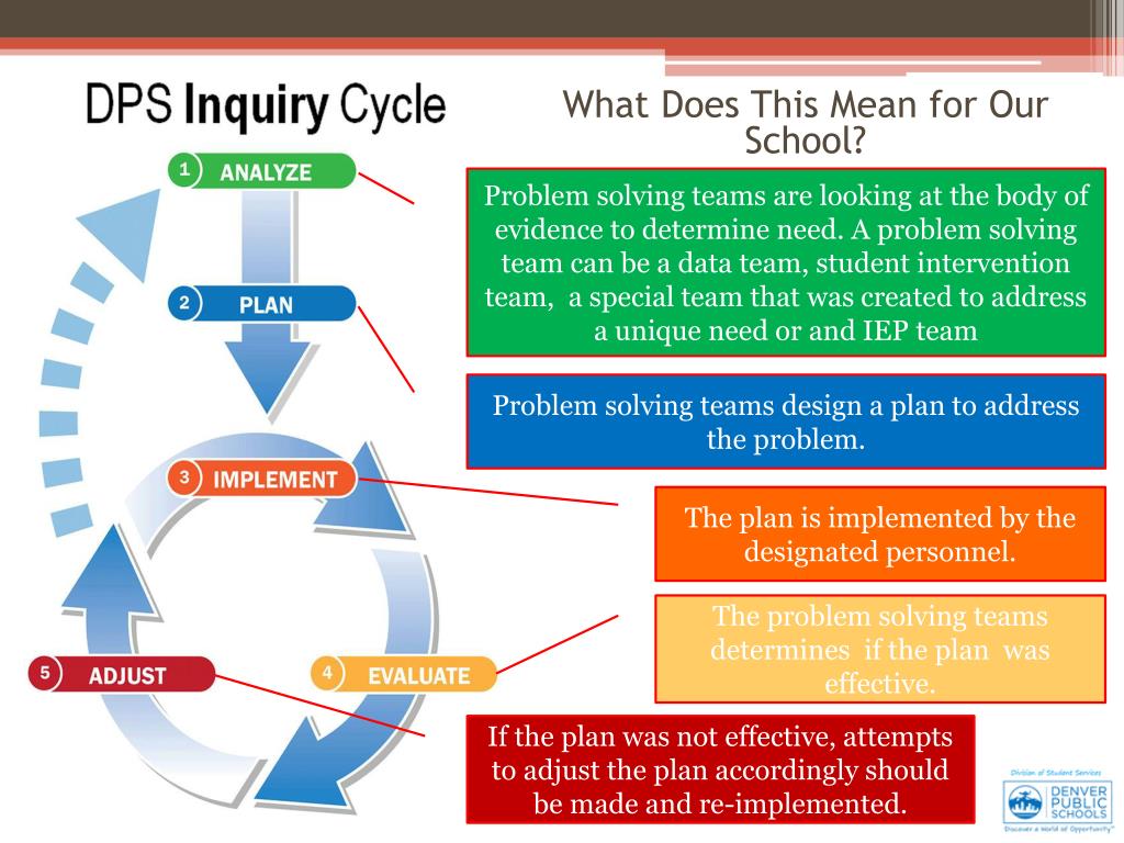 What Does This Mean for Our School? Problem solving teams are looking at the body of evidence to determine need. A problem solving team can be a data team, student intervention team, a special team that was created to address a unique need or and IEP team Problem solving teams design a plan to address the problem. The plan is implemented by the designated personnel. The problem solving teams determines if the plan was effective. If the plan was not effective, attempts to adjust the plan accordingly should be made and re-implemented.
