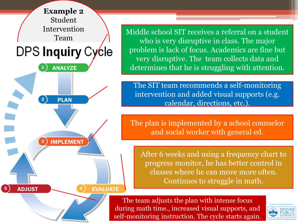 Example 2 Student Intervention Team Middle school SIT receives a referral on a student who is very disruptive in class. The major problem is lack of focus. Academics are fine but very disruptive. The team collects data and determines that he is struggling with attention. The SIT team recommends a self-monitoring intervention and added visual supports (e.g. calendar, directions, etc.). The plan is implemented by a school counselor and social worker with general ed. After 6 weeks and using a frequency chart to progress monitor, he has better control in classes where he can move more often. Continues to struggle in math. The team adjusts the plan with intense focus during math time., increased visual supports, and self-monitoring instruction. The cycle starts again.