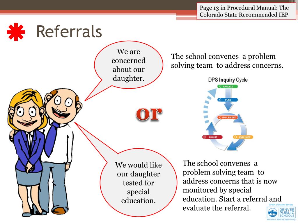 Page 13 in Procedural Manual: The Colorado State Recommended IEP Referrals We are concerned about our daughter. The school convenes a problem solving team to address concerns. or We would like our daughter tested for special education. The school convenes a problem solving team to address concerns that is now monitored by special education. Start a referral and evaluate the referral.