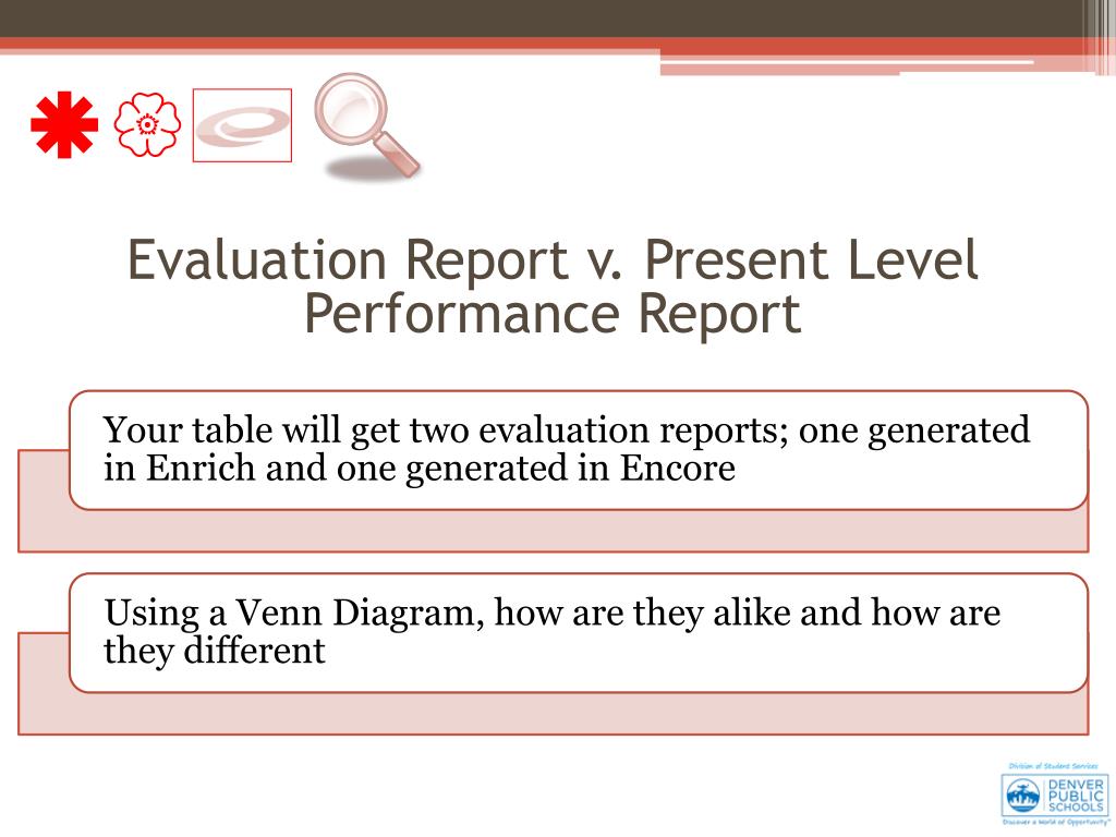 Verses Evaluation Report and Present Level of Performance were located in the same place. Evaluation Report and Present Level of Performance are separate because they have a different purpose. You don’t do a Present Level Report if you don’t qualify. To determine eligibility Evaluation And Present Levels Evaluation Present Levels To create specially designed instruction