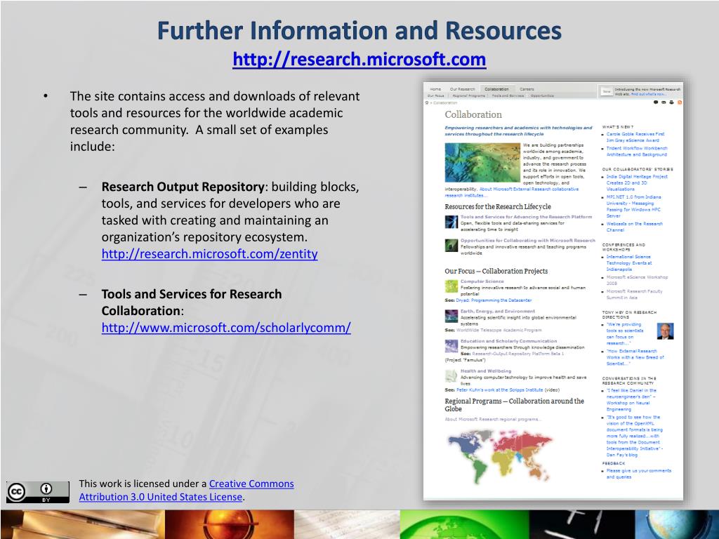 Further Information and Resourceshttp://research.microsoft.com • The site contains access and downloads of relevant tools and resources for the worldwide academic research community. A small set of examples include: • Research Output Repository: building blocks, tools, and services for developers who are tasked with creating and maintaining an organization’s repository ecosystem. http://research.microsoft.com/zentity • Tools and Services for Research Collaboration: http://www.microsoft.com/scholarlycomm/