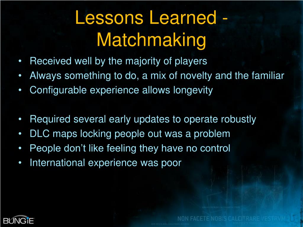 Lessons Learned - Matchmaking • Received well by the majority of players • Always something to do, a mix of novelty and the familiar • Configurable experience allows longevity • Required several early updates to operate robustly • DLC maps locking people out was a problem • People don’t like feeling they have no control • International experience was poor
