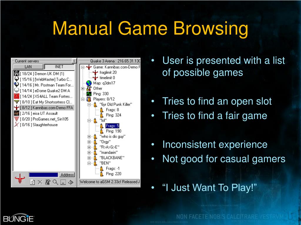 Manual Game Browsing • User is presented with a list of possible games • Tries to find an open slot • Tries to find a fair game • Inconsistent experience • Not good for casual gamers • “I Just Want To Play!”