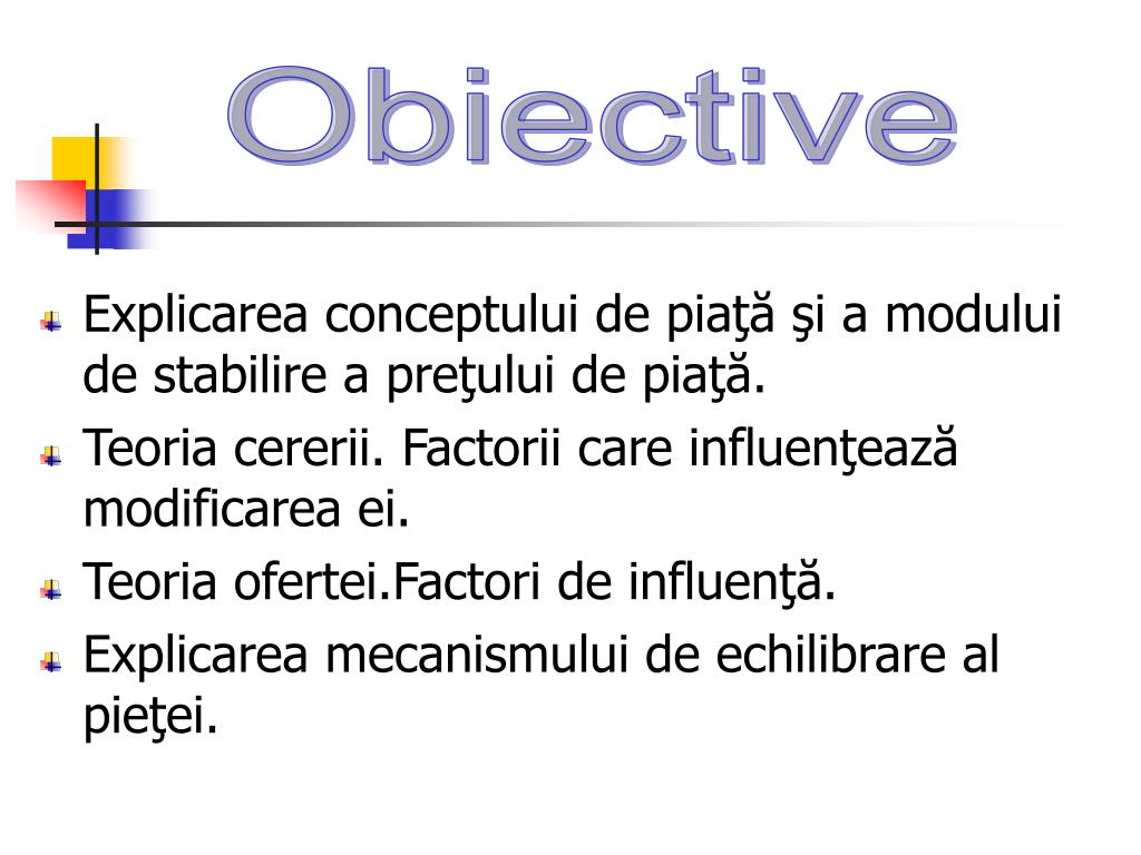 Obiective • Explicarea conceptului de piaţă şi a modului de stabilire a preţului de piaţă. • Teoria cererii. Factorii care influenţează modificarea ei. • Teoria ofertei.Factori de influenţă. • Explicarea mecanismului de echilibrare al pieţei.