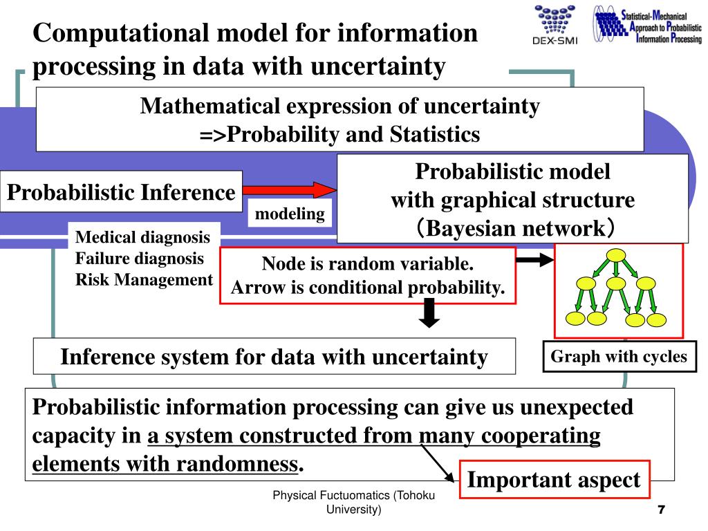 Mathematical expression of uncertainty =>Probability and Statistics Computational model for information processing in data with uncertainty Probabilistic model with graphical structure (Bayesian network) Probabilistic Inference modeling Medical diagnosis Failure diagnosis Risk Management Node is random variable. Arrow is conditional probability. Inference system for data with uncertainty Graph with cycles Probabilistic information processing can give us unexpected capacity in a system constructed from many cooperating elements with randomness. Important aspect Physical Fuctuomatics (Tohoku University)