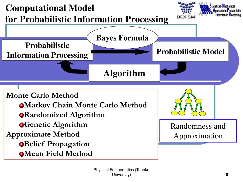 Bayes Formula Computational Model for Probabilistic Information Processing Probabilistic Information Processing Probabilistic Model Algorithm • Monte Carlo Method • Markov Chain Monte Carlo Method • Randomized Algorithm • Genetic Algorithm • Approximate Method • Belief Propagation • Mean Field Method Randomness and Approximation Physical Fuctuomatics (Tohoku University)