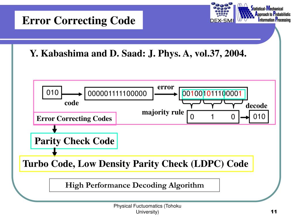Error Correcting Code Y. Kabashima and D. Saad: J. Phys. A, vol.37, 2004. error 010 000001111100000 001001011100001 code decode majority rule 010 0 1 0 Error Correcting Codes Parity Check Code Turbo Code, Low Density Parity Check (LDPC) Code High Performance Decoding Algorithm Physical Fuctuomatics (Tohoku University)