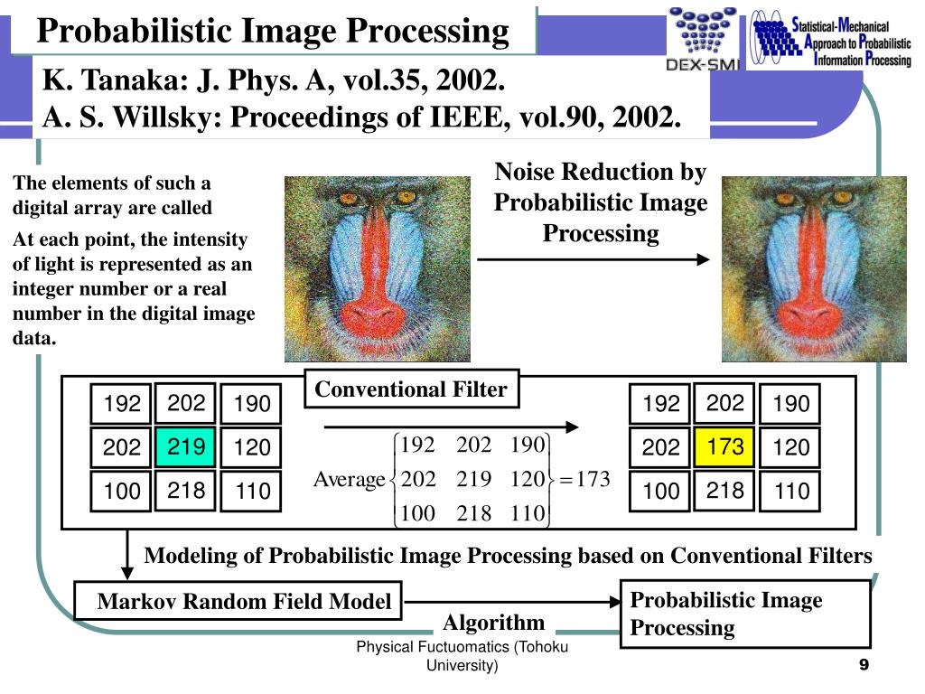 Probabilistic Image Processing K. Tanaka: J. Phys. A, vol.35, 2002. A. S. Willsky: Proceedings of IEEE, vol.90, 2002. • Probabilistic Image Processing Degraded Image (Gaussian Noise) MSE:520 MSE: 2137 Lowpass Filter Wiener Filter Median Filter MSE:860 MSE:767 MSE:1040 Physical Fuctuomatics (Tohoku University)